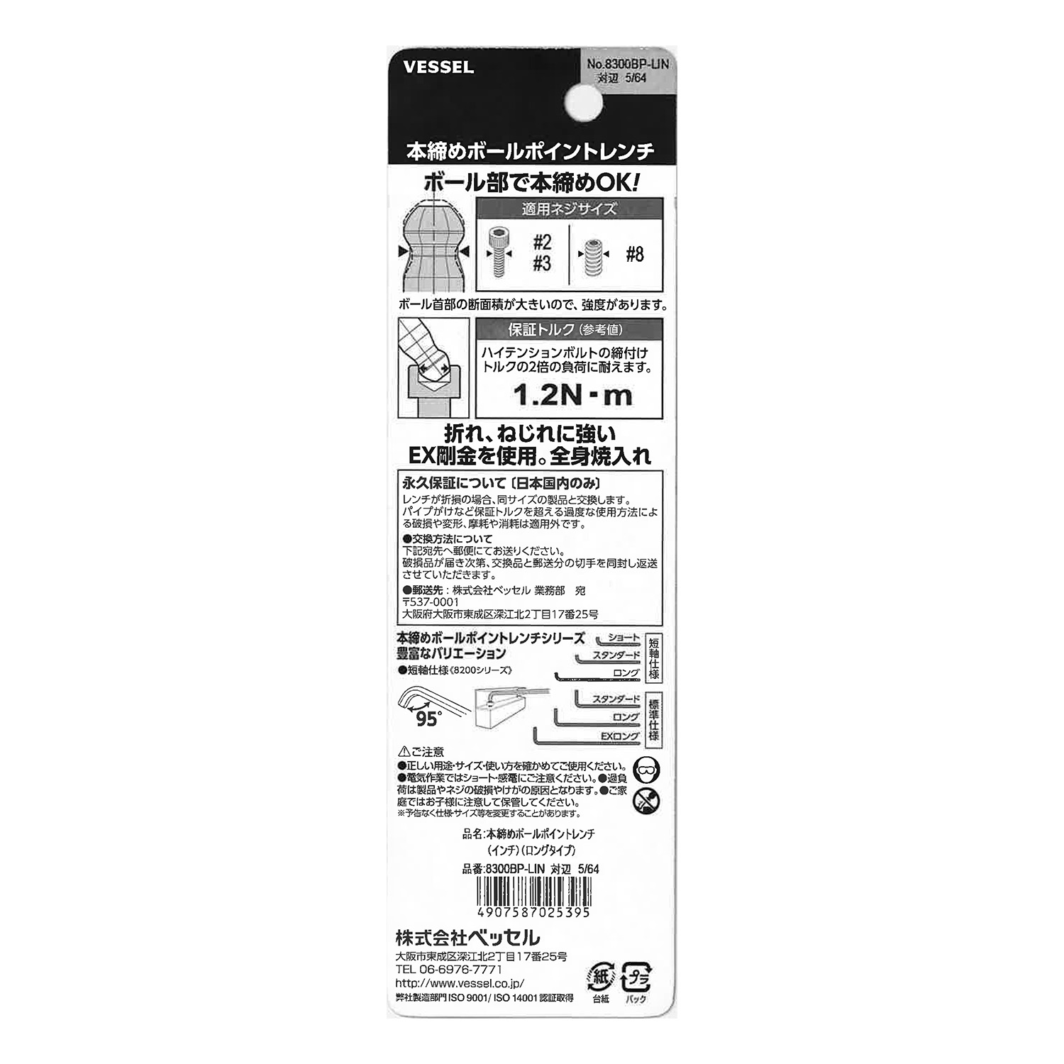 標示 | 主體總長mm | L型扳手的短邊尺寸mm | 主體重量g | 內包裝數量 | 外包裝數量 | 日本JAN條形碼 |